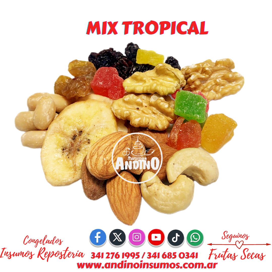 Mix tropical: castañas de cajú,nueces mariposa extrlight ,almendras non pareil, pasas rubias y morenas, chips de banana, ananá y maní tostado