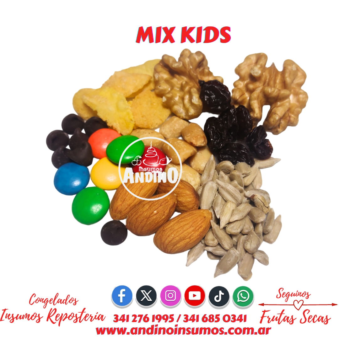 Mix kids: rocklets, copos de maíz, semillas de girasol, chips de chocolate, pasas morenas, nueces mariposa extralight y almendras non pareil